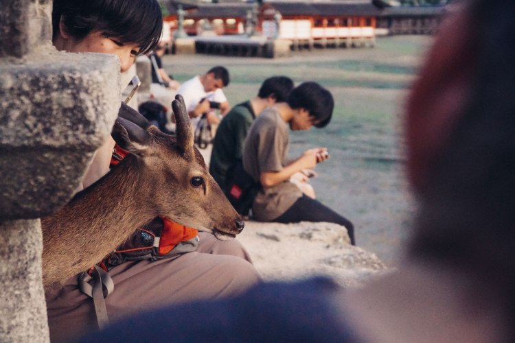 Quand nous arrivons en bas du Mont Misen, le soleil est en train de se coucher et nous nous dirigeons vers les berges pour s’asseoir et photographier le torii sous une belle lumière. La mer s’étant retirée en raison de la marée (eh oui, on l’oublie mais il y a aussi des marées au Japon), l’endroit est très animé et les touristes sont descendus sur le sable afin de se photographier au plus près du torii. Les daims sont de la partie et déambulent parmi les touriste en quête de nourriture, n’hésitant pas à fourrer leur museau dans les sacs et poches des gens peu attentifs.