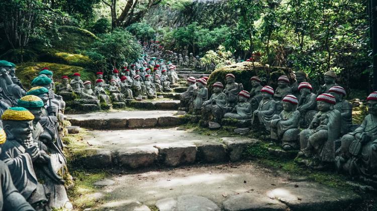 C’est ce que nous avons décidé de faire. Pour ne pas trop nous fatiguer sous la chaleur moite toujours présente, nous avons pris un téléphérique pour nous rendre au sommet du Mont Misen. On n’y arrive pas directement et il faut grimper quelques kilomètres à pied avant d’y arriver. On a pu traverser le temple Kiezu-no-hi, qui abrite de très nombreuse statuettes de jizo (figure bouddhique la plus appréciée des Japonais, c’est le gardien des défunts, protecteur de la famille etc.) ainsi qu’une flamme entretenue depuis 1 200 ans ! Quand nous atteignons le point le plus élevé du Mont Misen, le soleil nimbe le paysage environnant et la baie d’Hiroshima d’une lumière dorée fantastique. Et la-haut, il y a bien moins de touristes. La majorité s’arrête en haut du téléphérique car il faut quand même environ 30 minutes de marche pour se rendre au sommet du Mont Misen. Mais la balade en vaut vraiment le détour.