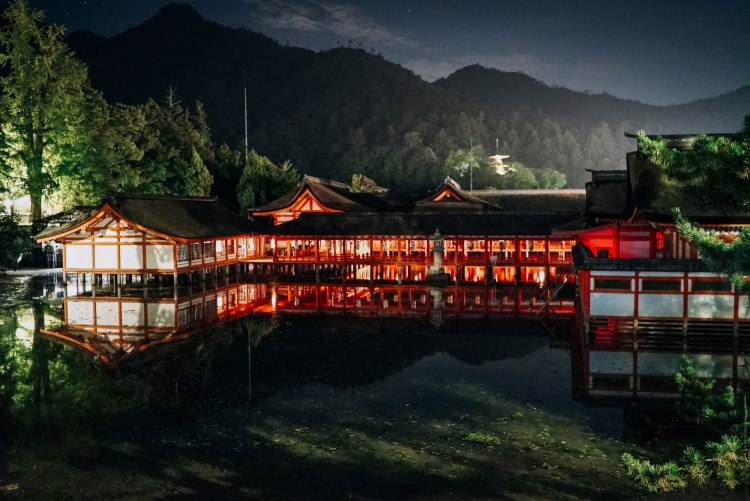 Après ce repas, nous décidons d’aller prendre l’air pour digérer tout ça avant de nous coucher. Nous espérons avoir secrètement une jolie vue du torii sans aucun touriste. Mais notre déception est assez grande quand nous constatons que de petits bateaux font la navette entre l’embarcadère et le torii pour passer en-dessous (la mer est déjà remontée). Même de nuit, il est dur de trouver un instant pour prendre le torii dans toute sa splendeur et sans intrus ! Cela renforce encore un peu plus mon impression d’être dans un parc d’attraction.