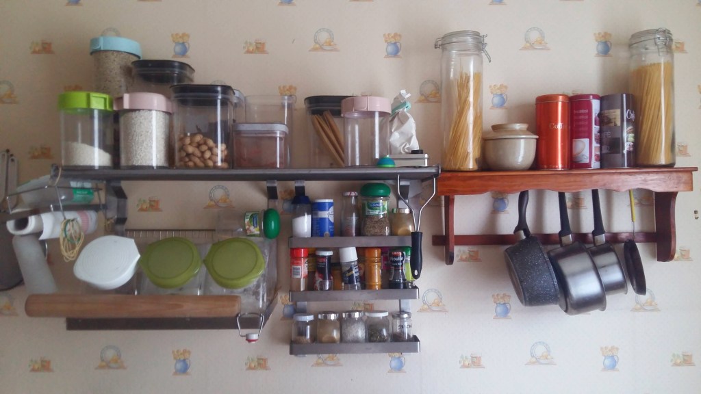 Notre étagère à épicerie sèche (et notre magnifique papier peint ^^’)