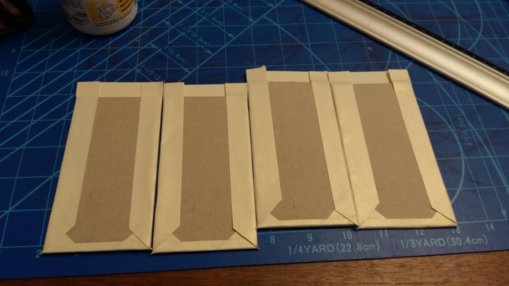 Une fois l’ensemble bien collé, on va finir de solidariser tout cela avec les 4 côtés. Ces parois font la largeur des tiroirs et la hauteur de la pile. Chez moi les parois font donc 6,7 cm de large et 12,7 cm de haut. Je les ai couvertes de papier, comme pour les 2 carrés. Par contre j’ai laissé la partie supérieure non collée, pour faire comme une « languette » qui viendra offrir une plus grande surface de collage en haut de la tour. J’enduis de colle, et je plaque sur le côté des tiroirs, en serrant bien. Et ainsi pour les 3 autres.