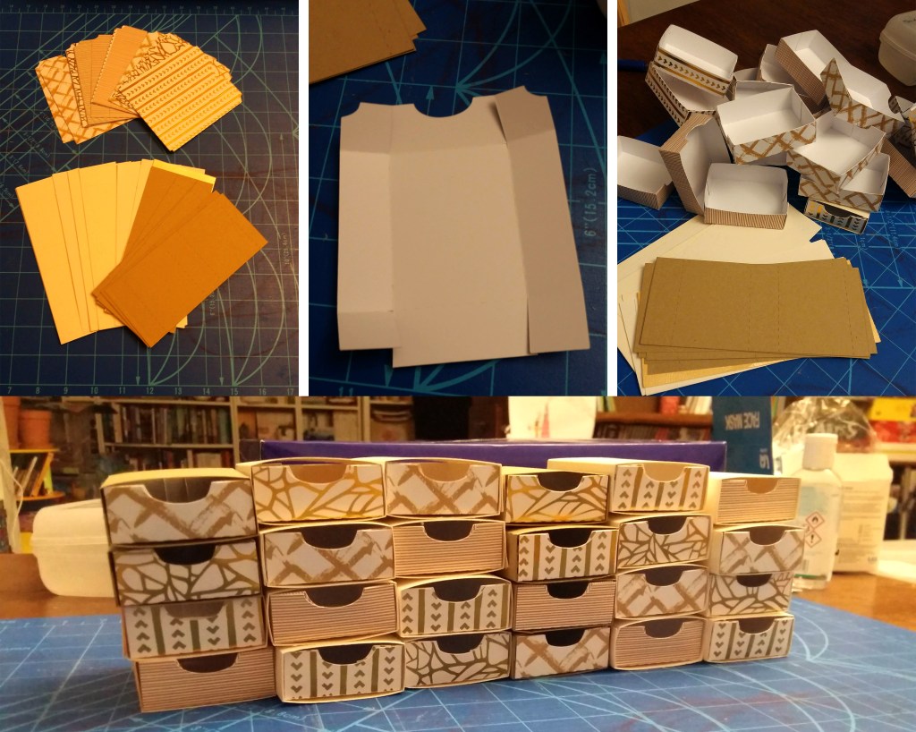 Bon, une fois mes papiers découpés (ça ne m’a pas pris longtemps : j’ai une machine qui découpe selon mes envies), j’ai assemblé le tout : on colle les tiroirs, on colle l’enrobage, et on glisse l’un dans l’autre. Hop ! 24 boîtes d’allumettes !