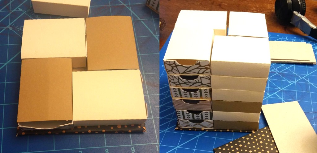 Sur le carré du dessous, on vient poser sur la face non couverte 4 boîtes, en prenant soin de laisser une marge autour. On colle juste le dessous et le dessus de la boite, on ne s’occupe pas des petits ou grands côtés. Une fois les 4 premiers posés, on continue ainsi à les superposer, en encollant juste la face qui va venir au contact de celle du dessous, à chaque fois. Pareil, il faut bien appuyer, que ça tienne.