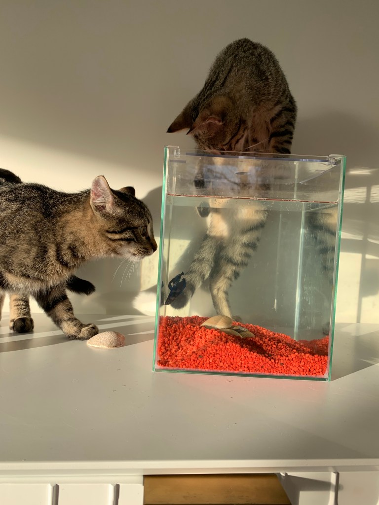 Une fois chez nous, ils ont rapidement pris leurs marques et sont adorables. Maintenant qu’ils sont plus grands, ils passent le plus clair de leur temps dehors, pour le plus grand bonheur du poisson qui arrête de frémir à chaque fois qu’un chat s’approche trop de son bocal !