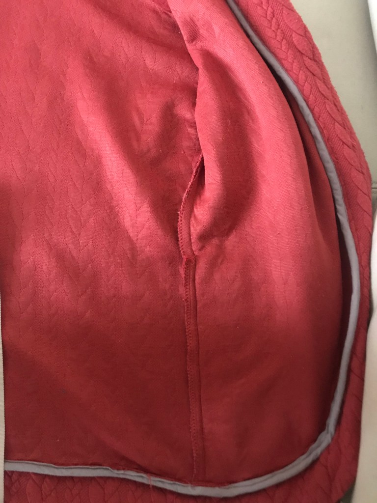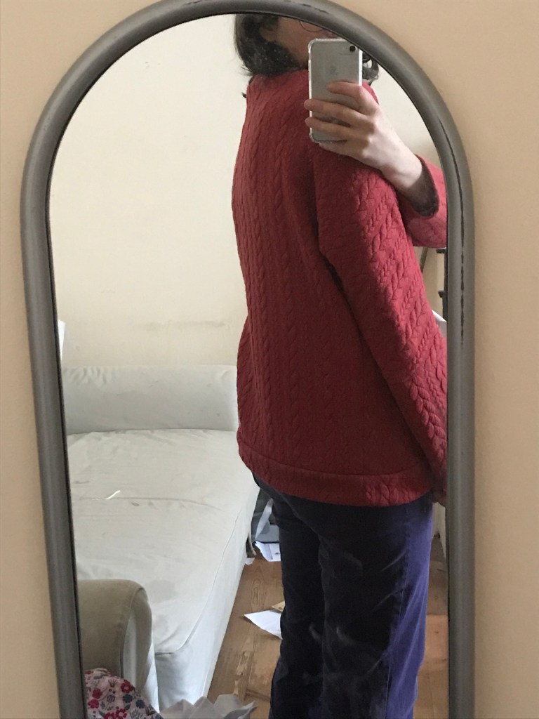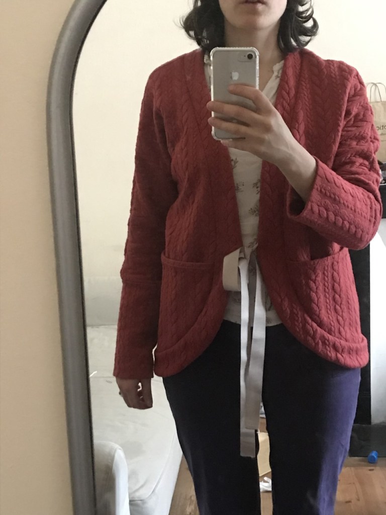 Petit bémol simplement sur les finitions. Sur une pièce telle que le Cardicool Cosmo, à savoir une veste qui ne se ferme pas ou peu, je trouve ça dommage de proposer simplement de surjeter les pièces une par une avant de coudre. J’ai choisi de ganser au biais la couture enforme/gilet, mais avec une marge de couture de 1cm, il aurait fallu que je trouve un biais plus petit que celui que j’ai utilisé : entre l’épaisseur des marges de couture et la taille du biais, il y a des endroits dont je ne suis pas fière. Pour une prochaine version, je pense ajouter 0,5cm à mes marges de couture et ganser toutes les coutures au biais.