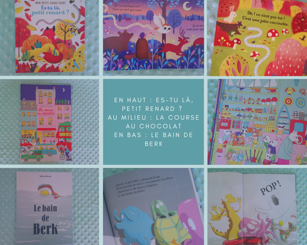 J’ai tout d’abord acheté un livre recommandé par Maxine : Le Bain de Berk. L’histoire d’un doudou qui tombe dans une baignoire pleine et que les autres jouets veulent essayer de sauver. La chute (de l’histoire, pas du doudou dans la baignoire) est très rigolote !