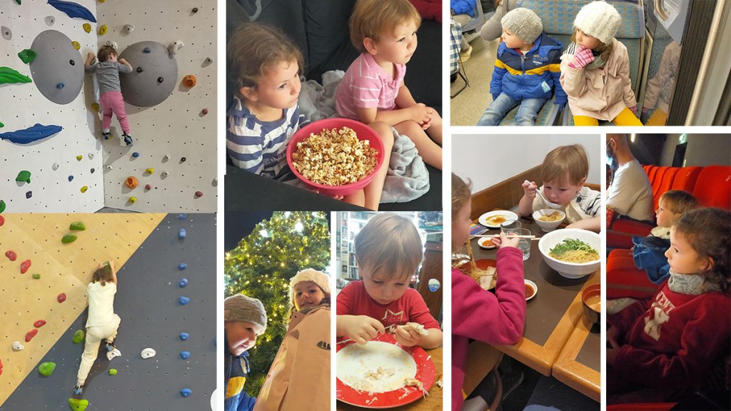 En novembre, leur journée a eu lieu sur mon jour d’anniversaire ! Nous sommes allés à Paris. Le Lampion voulait à tout prix prendre le train, nous avons fait un compromis : on s’est garés vers Montparnasse et on a navigué en métro. Il était ravi ! Nous avons déjeuné à Sapporo, notre restaurant de ramen préféré (nous avons d’ailleurs retrouvé une photo de moi prise pile 6 ans plus tôt, très enceinte de la Lueur, assise à la même place, mon bol de ramen en équilibre sur mon ventre…). Les enfants ont été très sages et ont impressionné nos voisins tant ils se débrouillent bien avec leurs baguettes, alors qu’eux même avaient demandé des couverts. Ensuite, direction le cinéma pour voir Encanto (une merveille au passage), c’était leur premier vrai cinéma et j’ai aussi été impressionnée. Ils sont restés très concentrés jusqu’à la fin, pas de besoin de pipi, et juste quelques larmes aux coins des yeux lors des moments émouvants. Le Lampion a juste été surpris par le « test » dolby surround qui lui a fait tourner la tête en tous sens et nous a bien fait rire. Après quoi nous sommes allés profiter des illuminations et vitrines de Noël, puis nous avons retrouvé des amis au restaurant japonais.