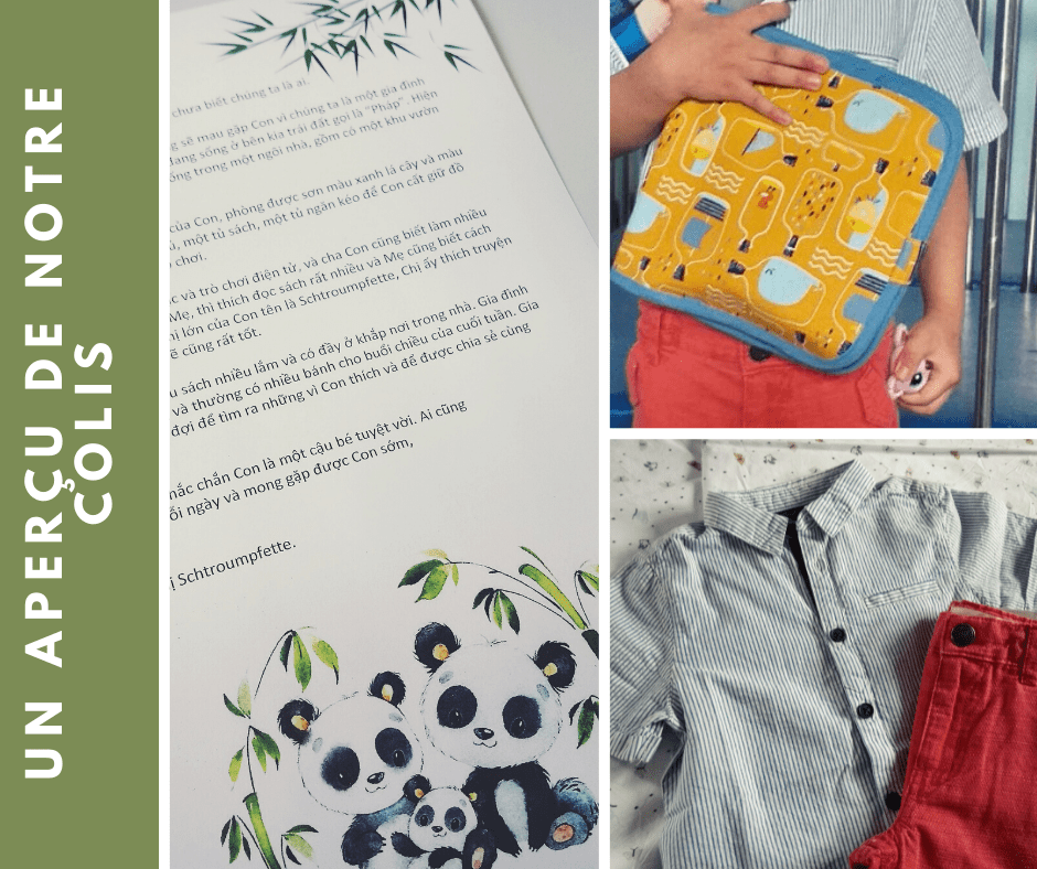 Notre OAA ne nous a pas donné réellement d’indication sur ce que nous pouvions mettre dans ce colis. C’est assez nouveau pour eux, et ce n’est accepté que parce que l’éloignement peut durer encore longtemps. Nous ne les avons pas sentis très enthousiastes à cette idée. En effet, envoyer des jouets/des doudous crée des disparités et des jalousies entre les enfants à l’orphelinat. Mais ils ont cependant réussi à faire le nécessaire pour que notre colis puisse être transmis.