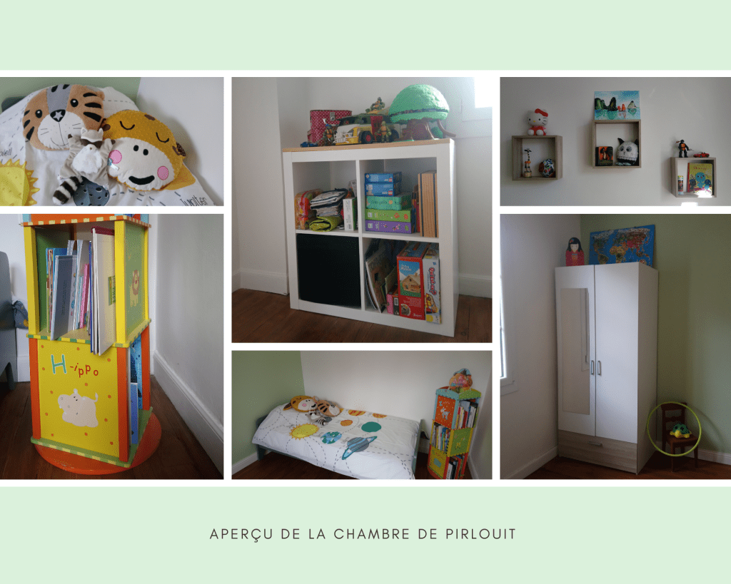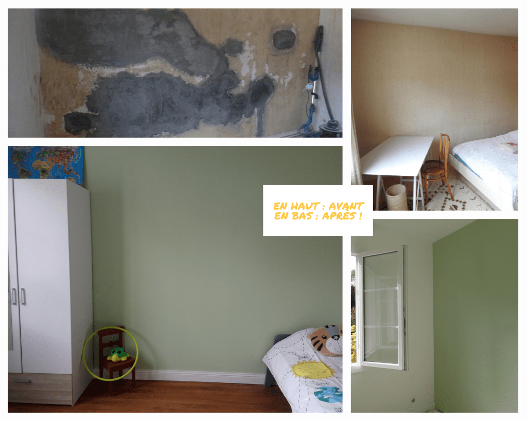 Lorsque nous avons emménagé, la chambre qui était prévue pour Pirlouit était en piteux état avec sa tapisserie des années 80, sa moquette tachée et l’un de ses murs bien abîmé (mais caché par une tapisserie et une couche de polystyrène qui a été une horreur à enlever).