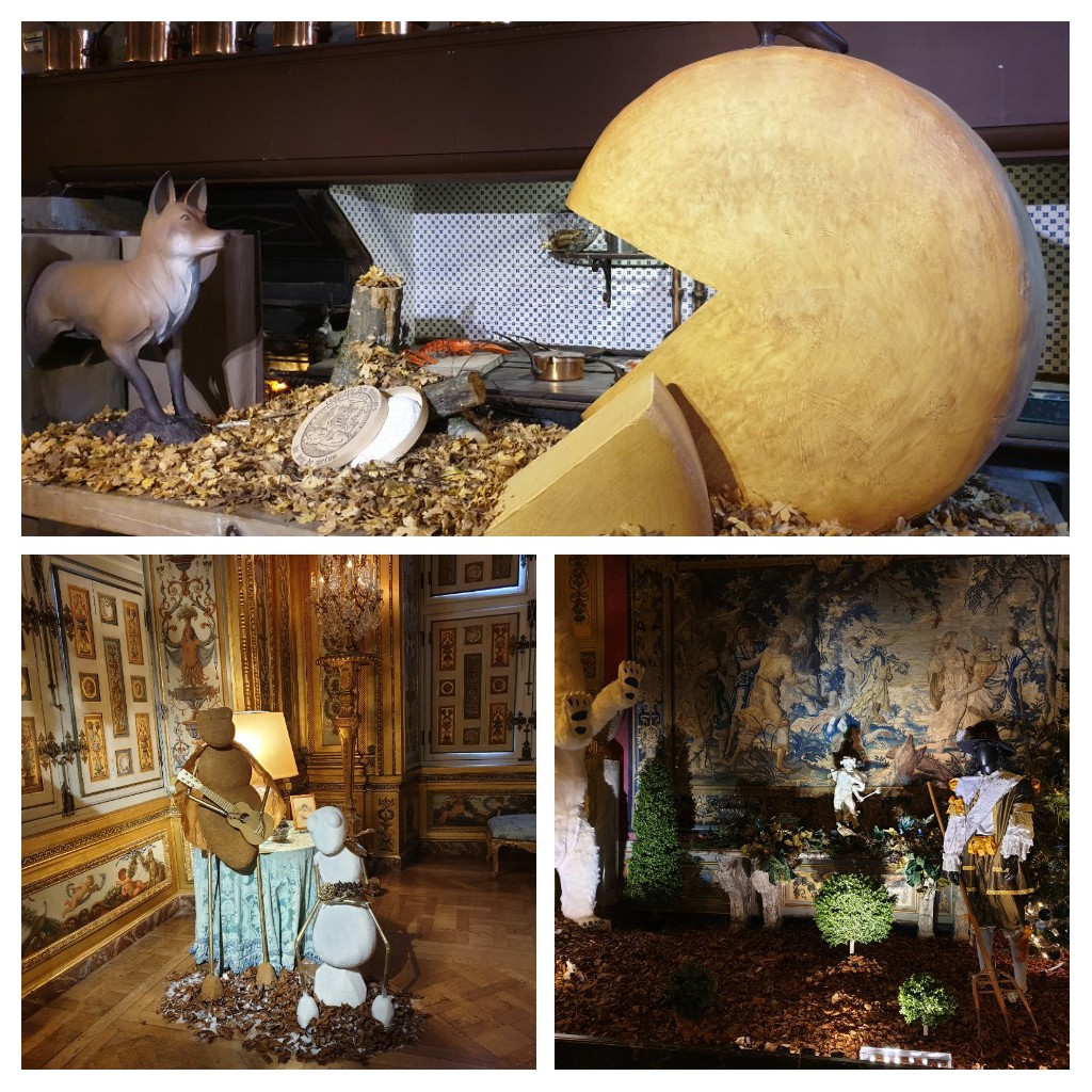 L’an dernier, la thématique des décorations était Les Fables de La Fontaine. J’ai beaucoup aimé ce choix que je trouve très ludique pour petits et grands. Dans chaque pièce, nous pouvions jouer à deviner quelle fable est illustrée et en cas de trou de mémoire, le texte de Jean de La Fontaine était écrit dans un coin de la pièce. Chaque pièce du lieu était décorée dans les moindres détails, on passait d’une ambiance à une autre avec la même impression de cocooning notamment due à la présence de feux de cheminée. On sent qu’une attention a été portée à l’ensemble des décors, la vaisselle est superbe, toutes les boules de Noël sont travaillées et de grande qualité. Tout est féerique y compris les cuisines (il y a une sorte de pièce montée en biscuits de Reims qu’on a envie de dévorer).