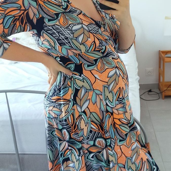 Me voici enfin en congé, je suis à bout de souffle sans arrêt. Rester debout derrière l’évier 10min me donne des palpitations, je mets 30minutes à récupérer. Je garde mes enfants le mercredi, je les récupère le soir à l’école, et je m’écroule le week-end pendant que papa gère. Parfois piscine pour faire descendre la température, ça me fait un bien incroyable. Vivement les vacances ! Je profite de mes journées de temps libre pour régler le problème de la voiture : faire tenir 3 sièges auto sur une banquette qui ne fait pas 3 vraies places, c’est chaud. Mais je m’en suis sortie, mes parents nous offrent le siège du Luciole. Je me penche sur le mode de garde, mais ça va être galère. Pas de place en crèche. Je couds, en attendant, je ne me suis jamais autant cousu de trucs (mais il faut bien faire rentrer ce ventre quelque part !)