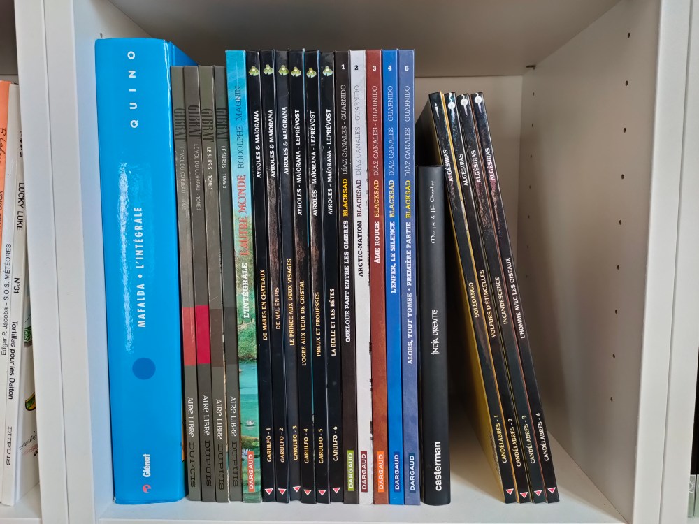 J’adore les BD, je suis heureuse d’avoir enfin la place de les exposer dans mon salon, mais pas à hauteur d’enfant. Blacksad est un incontournable, tout comme les séries de Loisel (Peter Pan, Magasin Général, Le grand mort, Un putain de salopard)etc. J’aime les BD qui se lisent en 1 tome ou 2, un peu comme un roman, comme Là où le regard ne porte pas que j’affectionne particulièrement.