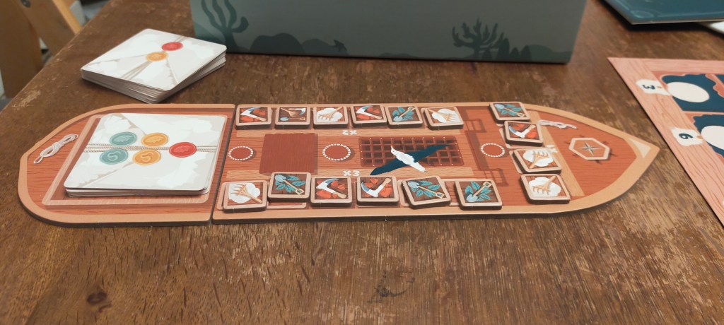 Maintenant, on se rend sur l’île. Dans notre bateau, nous avons des outils : des râteaux pour creuser le sable, des pelles pour fouiller en forêt, et des pioches pour tailler la roche. Ceux si sont posés aléatoirement aux 3 emplacements, qui représentent le nombre de fois de suite qu’on peut utiliser cet outil avant de s’en défausser (1 à 3).
