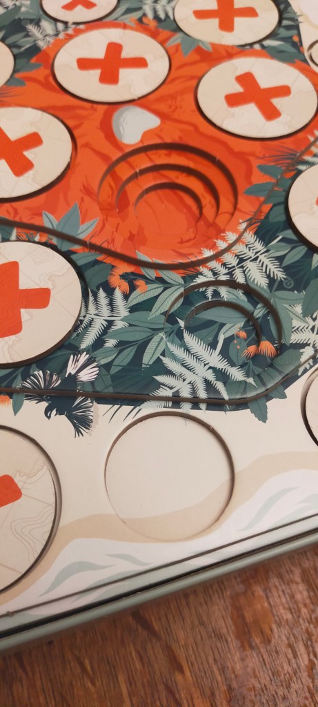 Le plateau quant à lui, représente une île abandonnée dans laquelle on va venir chercher les trésors perdus… Sa forme de montagne permet le dispatch aléatoire des jetons représentant les trésors. Il y a 6 types de trésors, répartis chacun en 2 exemplaires de 3 tailles différentes. Les trésors se superposent dans les espaces adaptés : 2 étages en forêt, 3 en montagne.