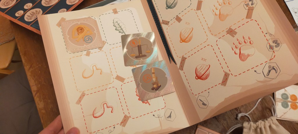 Une fois la mission accomplie, on a un super cahier d’aventurier à remplir avec des cartes double face. Un côté simple pour la mission « de base », et un côté brillant quand on a réussi la mission difficile… C’est la chasse aux trophées, et ça donne vraiment envie de rejouer pour s’améliorer ! Les cartes se « coincent » dans le livret par 2 fentes, ce qui permet de les faire et défaire à loisir, permettant de rejouer comme on veut ou de garder le livret en l’état d’une partie à l’autre.