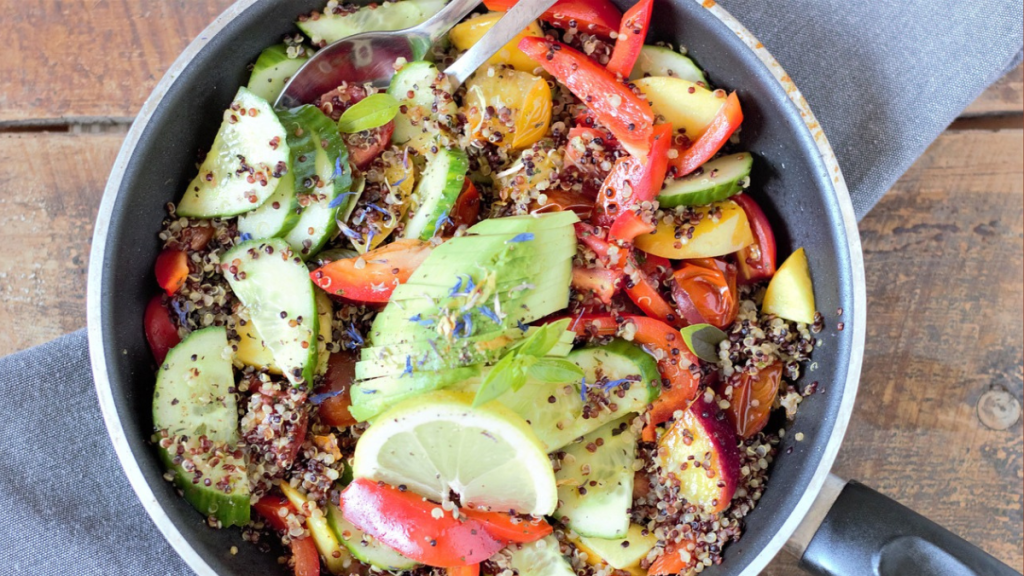 Je te propose une petite salade que j’aime bien faire l’été à base de quinoa. Parfait pour les pique-nique ou mes déjeuners du boulot. Petit bonus : il existe plein de variantes possibles.