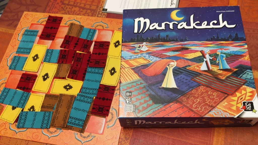 Marrakech est un jeu de Gigamic, dans lequel on joue Un marchand de tapis ! Son petit pion se déplace en parcourant le marché, et paye ses tapis à l’un ou l’autre. Chaque joueur a une ou deux couleurs de tapis (selon le nombre de joueurs au total).