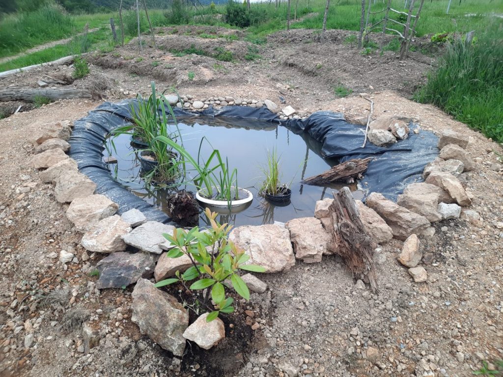 C’est n’est pas un très grand potager, mais il me plaît. J’aime sa disposition. Cette année, j’ai même choisi d’y ajouter une petite mare, pour favoriser un petit écosystème (en espérant que cela fasse venir les prédateurs de limaces et rats taupiers). Après avoir creusé le sol, nous avons tapissé de sable avant d’installer une bâche adaptée. Les pluies de mai l’ont vite remplie ! Quelques plantes aquatiques y sont placées dans des pots. Différents insectes et oiseaux s’en approchent déjà ; j’ai hâte d’y voir des grenouilles, libellules, salamandres…