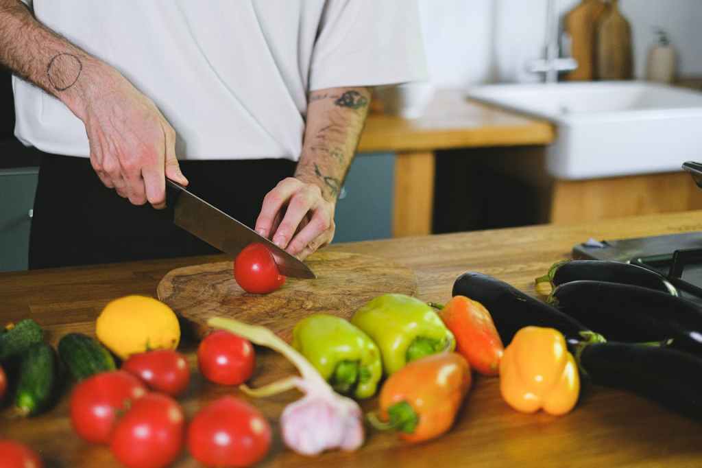 Coupe tes légumes en petits cubes, et l’ail en minuscules morceaux. Moi j’épluche l’aubergine pour qu’elle passe inaperçue dans le plat, au cas où les enfants soient dans un mauvais jour.