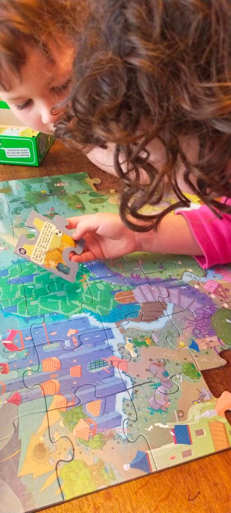 C’est donc un puzzle qui se présente dans une boîte qui rappelle bien le reste de la collection. Sur 3 des côtés sont présentés les 3 personnages de l’aventure, tu vas devoir en choisir un. Ensuite et bien, il faut recomposer le puzzle ! C’est un grand paysage médiéval, et en le remontant, tu vas bien sûr voir des détails rigolos. Une fois le puzzle fait, retrouve le héros que tu veux incarner dans l’image, retourne la pièce, et suis les consignes ! De pièce en pièce, tu vas te déplacer à travers tout le puzzle pour retrouver ton bébé dragon qui s’est enfuit. Et le petit truc sympa ? Tu dois ranger les pièces « utilisées » dans la boîte.. et hop ! Tout est rangé, presque sans te rendre compte !