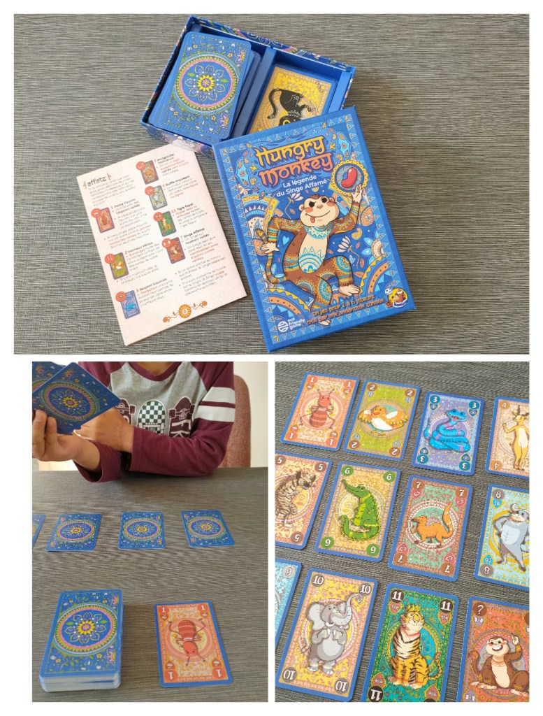 C’est un jeu dont les parties sont courtes (cela se joue en 3 manches, mais on peut faire une partie comme ça sans compter les points). C’est indiqué à partir de 8 ans mais Pirlouit y joue depuis ses 7 ans sans souci, et il a très vite compris ! On peut y jouer de 2 à 6, ce qui est également un atout de ce petit jeu très sympa.