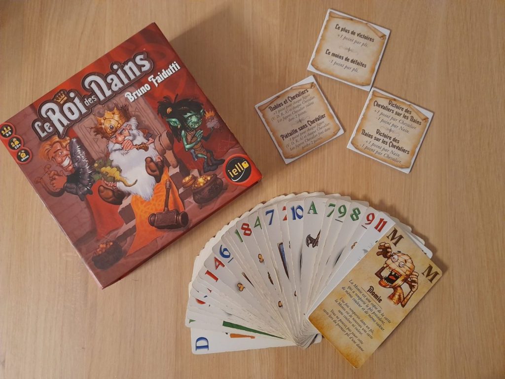 Le Roi des Nains est un jeu de plis, comme le tarot ou la belote donc mais qui se joue avec trois familles de cartes : les Chevaliers, les Nains et les Gobelins. La subtilité est que la règle change à chaque tour de jeu : faire le maximum ou le minimum de plis, récupérer le plus ou le moins de Gobelins, avoir ou ne surtout pas avoir la Reine des Nains… L’objectif et la stratégie varient à chaque tour, on peut donc enchaîner les parties sans se lasser. Des cartes spéciales viennent de plus pimenter le jeu et peuvent renverser les situations. C’est simple mais pas trop, rapide et drôle, on l’apprécie beaucoup !