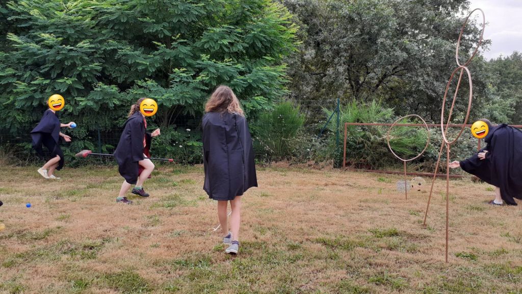 Monsieur Pic faisait les tests pour le Quidditch : à quelle place pourrait-elle intégrer l’équipe de Quidditch ? Poursuiveuse ? Il fallait lancer plusieurs balles à travers les cerceaux tout en évitant les cognards (ballons en mousse, nous sommes tout de même sympa !). Gardienne ? Il fallait être rapide pour empêcher les autres de marquer. Attrapeuse ? Il fallait attraper Capucine, 6 ans, toute de jaune vêtue et ailes dans le dos, qui courait dans le jardin ! Je ne suis pas certaine que SuperCopine se fut montrée très performante pour le Quidditch… mais nous avons bien rigolé !!