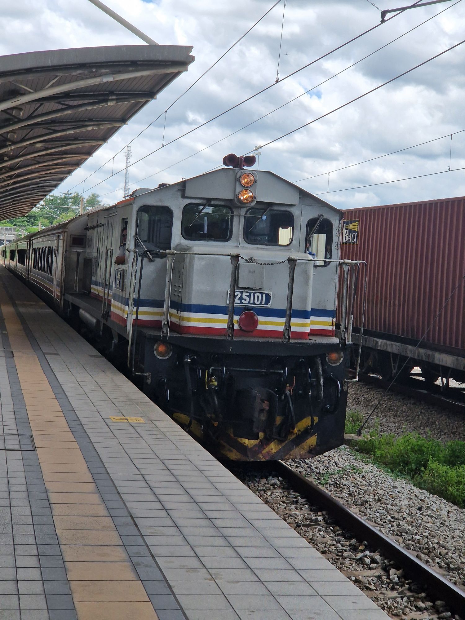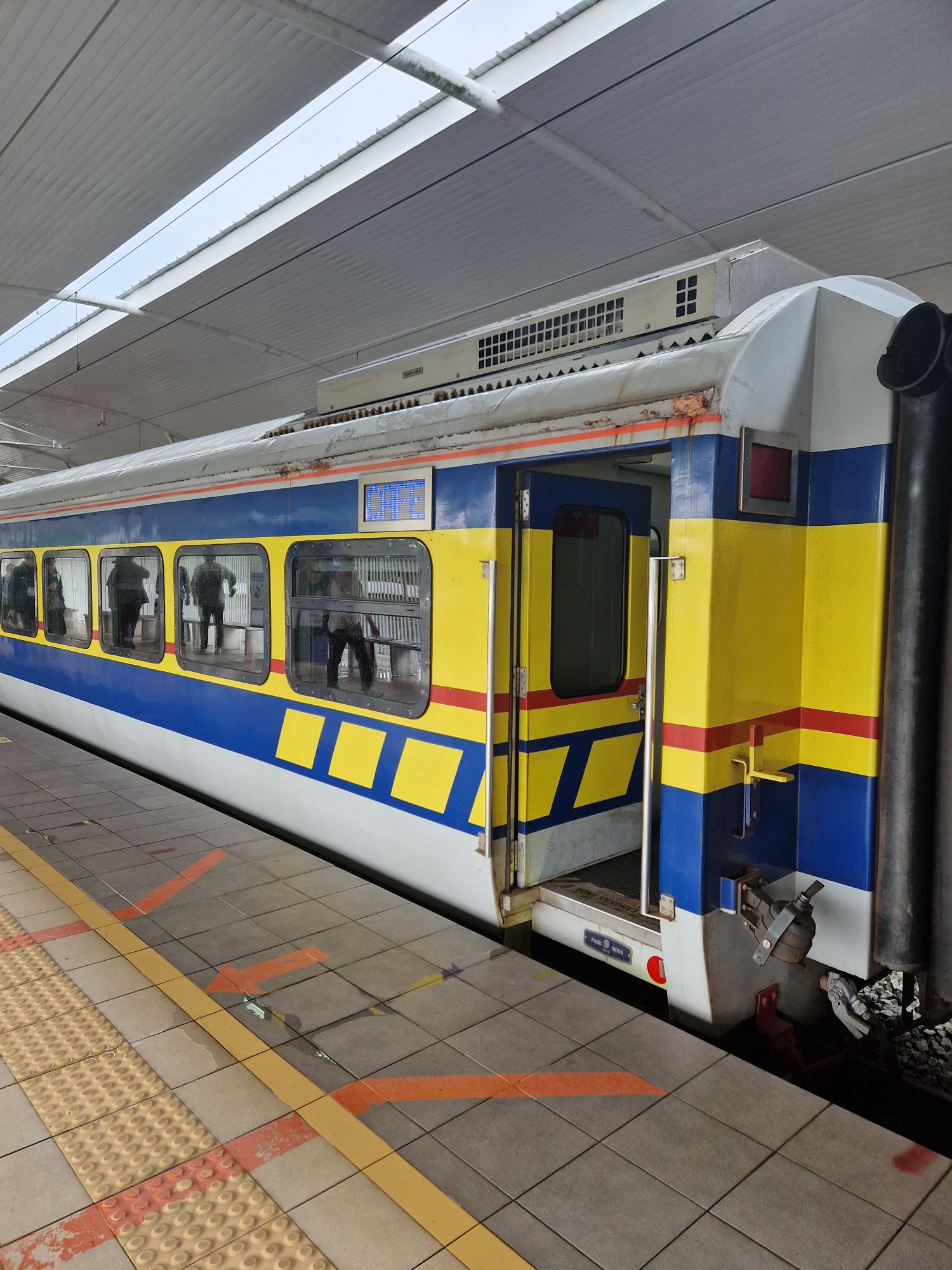 De Taiping à Butterworth (d’où part le ferry) il y a une connection en TER local (train pas cher sans reservation). Mais on n’arrivait pas à prendre les billets. On s’est donc pointés en gare 10 minutes avant le train, et en fait, c’était facile, billets, passer devant tout le monde comme des fleurs (c’était le weekend de Deepavali – une fête hindoue assez suivie, il y avait du monde partout – d’ailleurs les trains normaux étaient pleins) et embarquement dans … Une rame diesel des années 90.