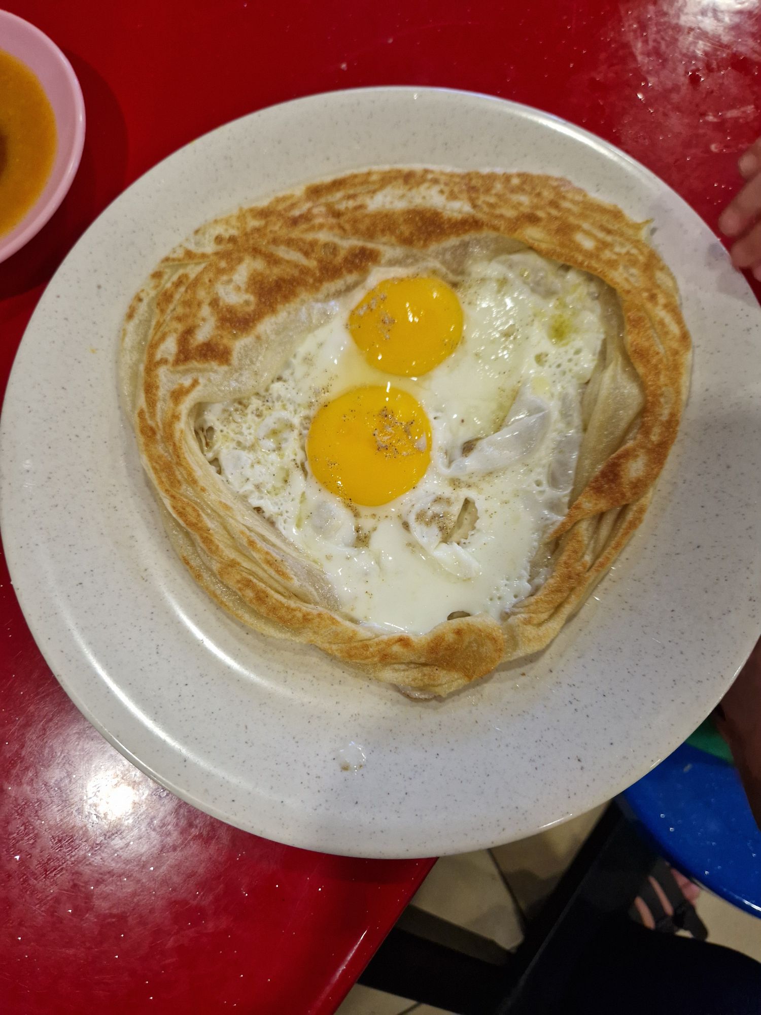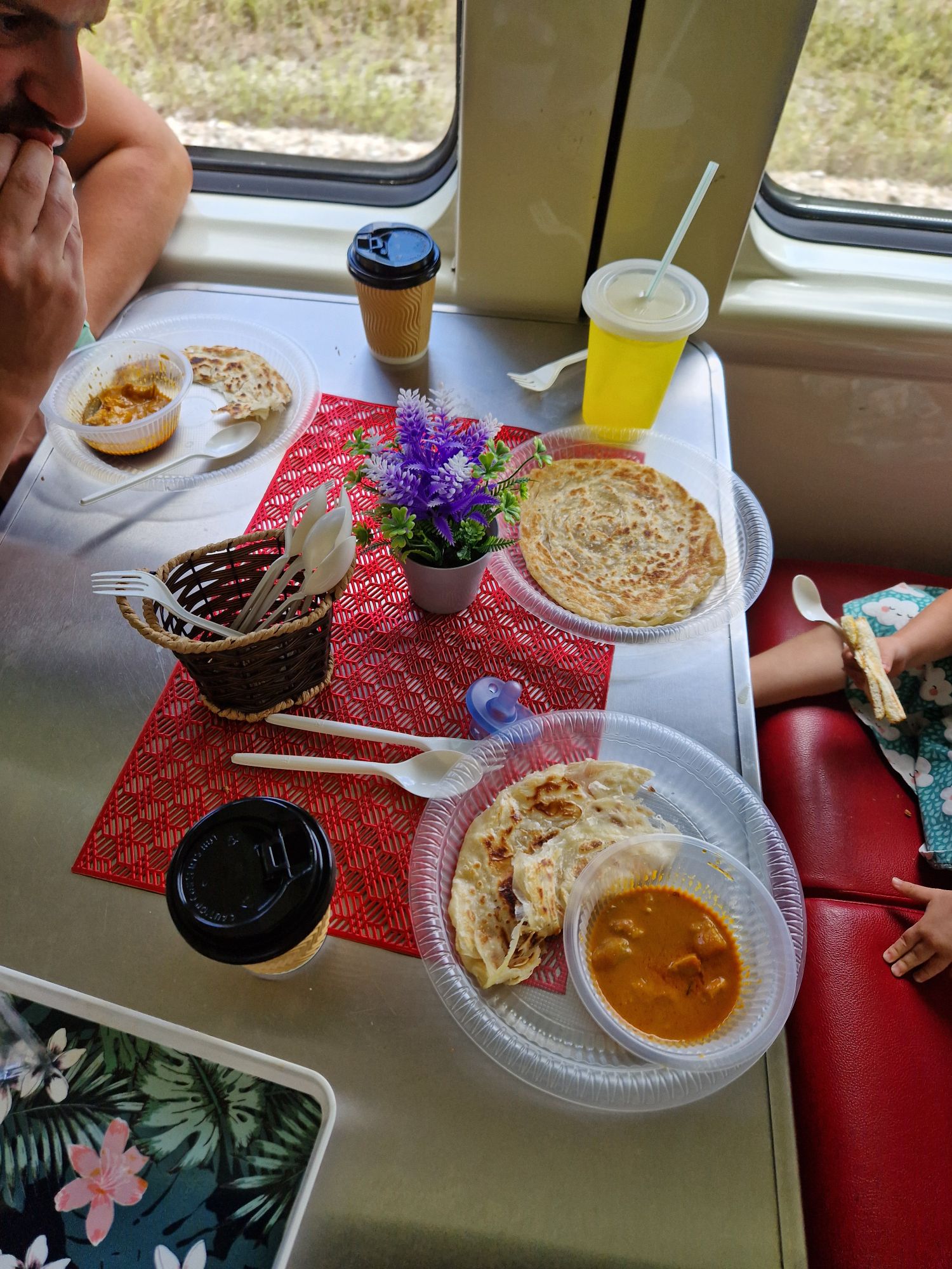 Jusque là, tout allait bien. Sauf que … Il était midi tapantes, y’en avait pour bien 2h, si toi aussi t’as un bambin tu vois très bien la faille : quand est-ce qu’on mange ?! Et bien, facile, y’a un restaurant dans le train ! Enfin, plutôt un café, qui fait des roti canai (sorte de petit pain feuilleté, parfois connu sous le nom de pratha ou paratha) et des currys de poulet. Parfait.