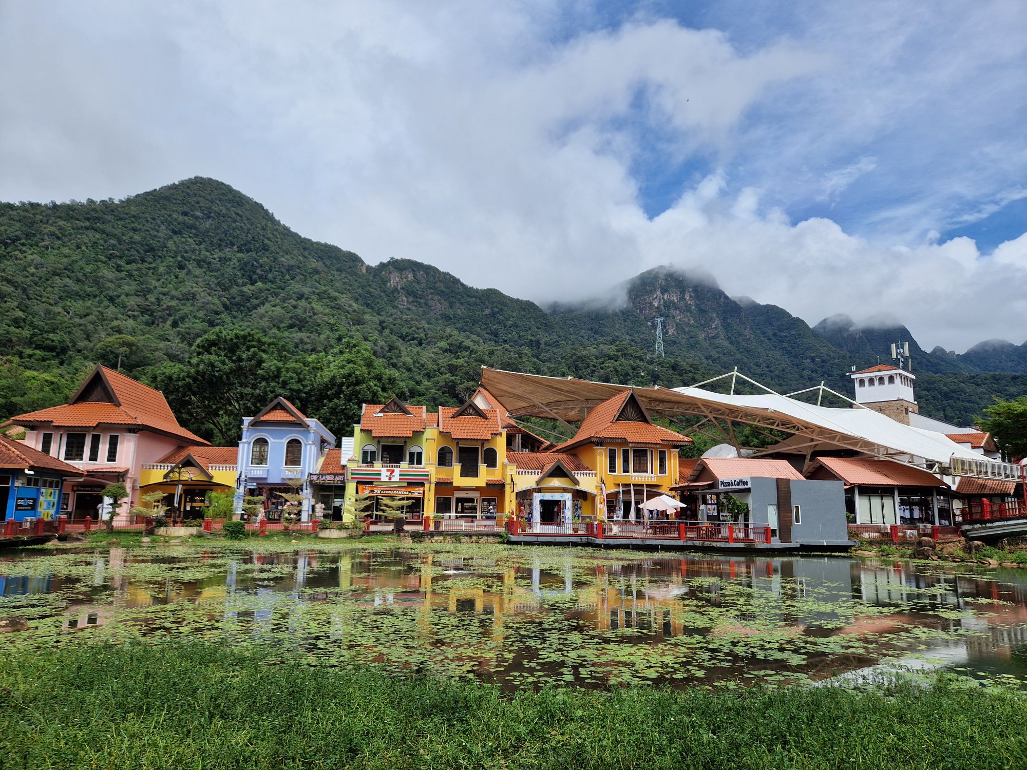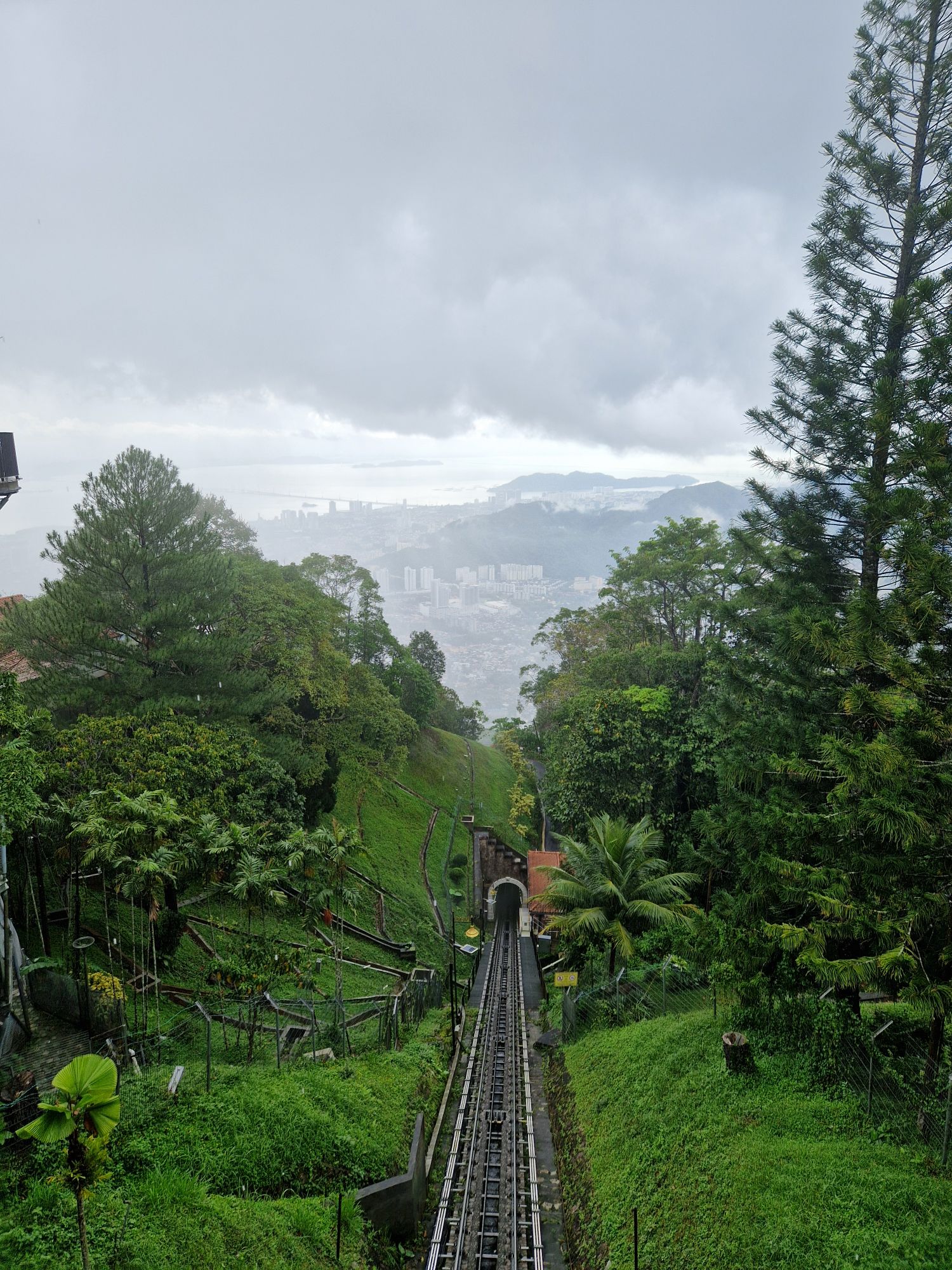 Bref, nous arrivons à Penang, sans encombre. On avait décidé de sortir un peu du centre ville qu’on a déjà exploré pour voir un peu d’autres parties de l’île. Grand hôtel, piscine, tobogans : on a fait les choses bien. Sache qu’un troizanetdemi, quand ça passe la journée dans la piscine, ça mange beaucoup et ça dort très bien 🤣. On a quand même pris une journée pour aller à Penang Hill, la colline la plus haute (je crois) de l’île, accessible en funiculaire. En haut, y’a quelques boutiques, un food court (où on a mangé), et quelques bâtiments datant de l’époque coloniale quand les British allaient se rafraichir en altitude. Mais surtout, il y a une jungle magnifique et une vue imprenable sur toute l’île. Ce jour là, le planning apparemment c’était : pluie, pluie diluvienne, pluie, déluge, pluie. Mais on a quand même réussi à se balader et à profiter relativement au sec – malgré les 100% d’humidité ambiante.