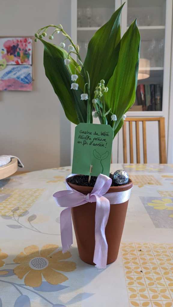 Nous avions annoncé l’arrivée de P’tite Lu avec un gros œuf de Pâques sur lequel était inscrit « j’éclos en Octobre » ! Et mon frère a annoncé l’arrivée de ma nièce l’année suivante, de manière similaire avec un œuf en chocolat accompagné d’un rébus. Cette fois-ci trop tôt pour viser Pâques où je ne le savais moi-même que depuis seulement 2 jours. Nous avons choisi l’occasion du 1er mai pour offrir un brin de muguet accompagné d’un petit œuf en chocolat et d’une étiquette « graine de bébé » !