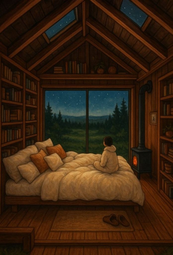 Si je pouvais continuer de rêver, un toit qui s’ouvrirait pour pouvoir regarder les étoiles ce serait juste parfait, et évidemment un poêle dans un coin pour réchauffer la pièce. J’avoue ça semble un peu dangereux et j’aurais peur des incendies, mais comme c’est un lit idéal, les incendies, ni les moustiques d’ailleurs, ni les bébêtes dans la forêt, n’existeraient.