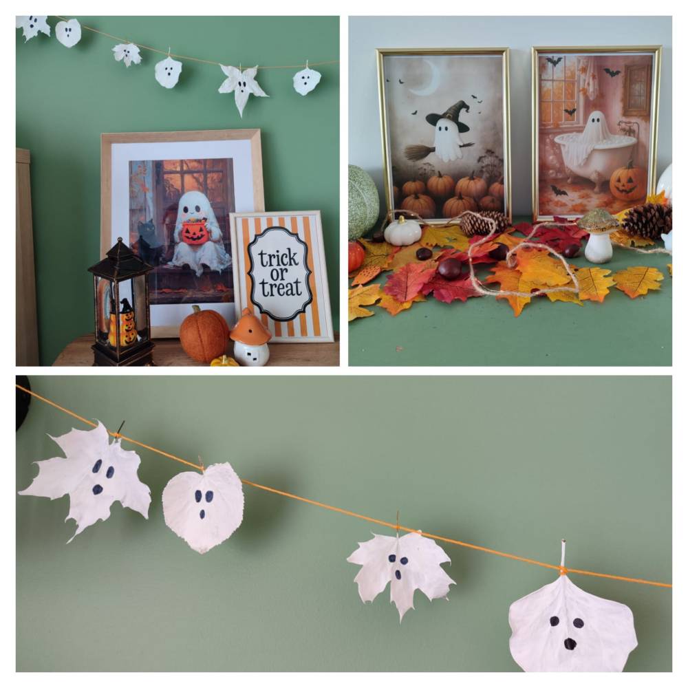 - des guirlandes de fantômes à base de feuilles : un peu de peinture, un marqueur noir, de la ficelle et le tour est joué (attention à prendre les feuilles « fraiches » encore souples car si elles sont sèches elles vont craquer avec la peinture, je sais j’ai essayé ;)) ;