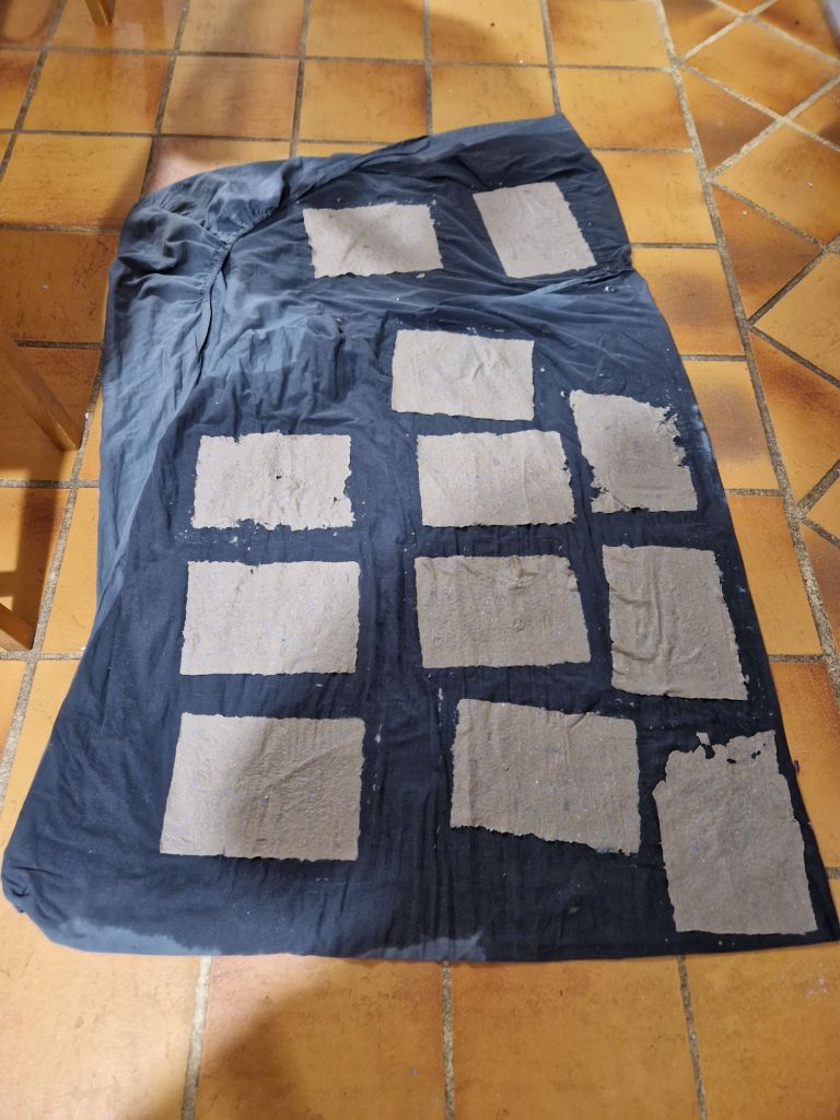 C’est là que le fun commence : plonge le tamis dans la pâte a papier, remonte le, égoute, recouvre d’un tissu pour éponger le maximum d’eau, puis retourne tout ça sur ton drap.