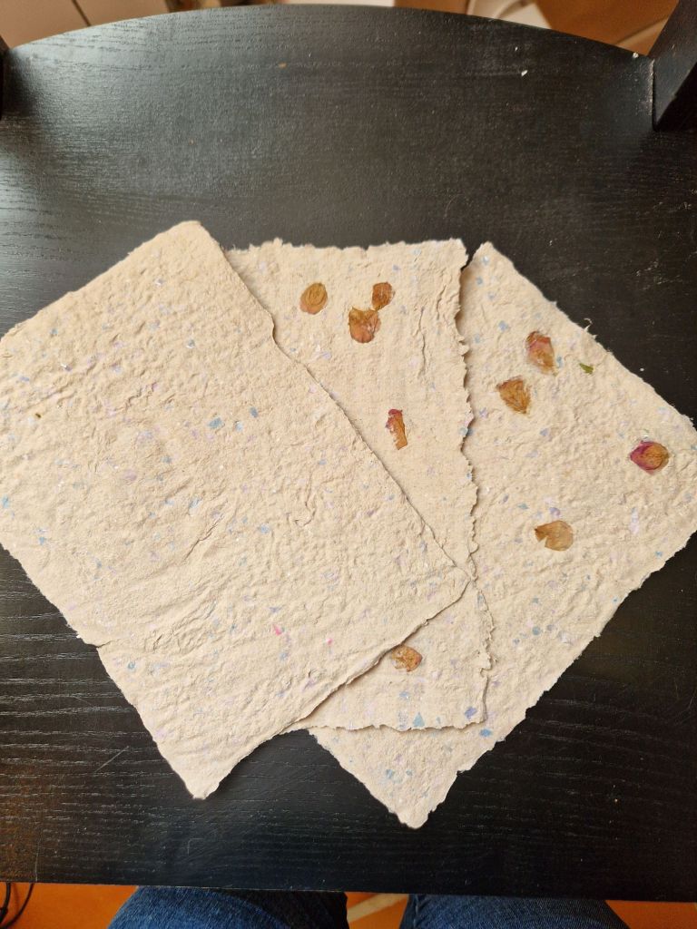 Récemment, la maitresse a été malade. 6 jours entiers. La Poupette est restée à la maison, et au 6ème jour, à court d’idées, on a décidé de faire du papier.